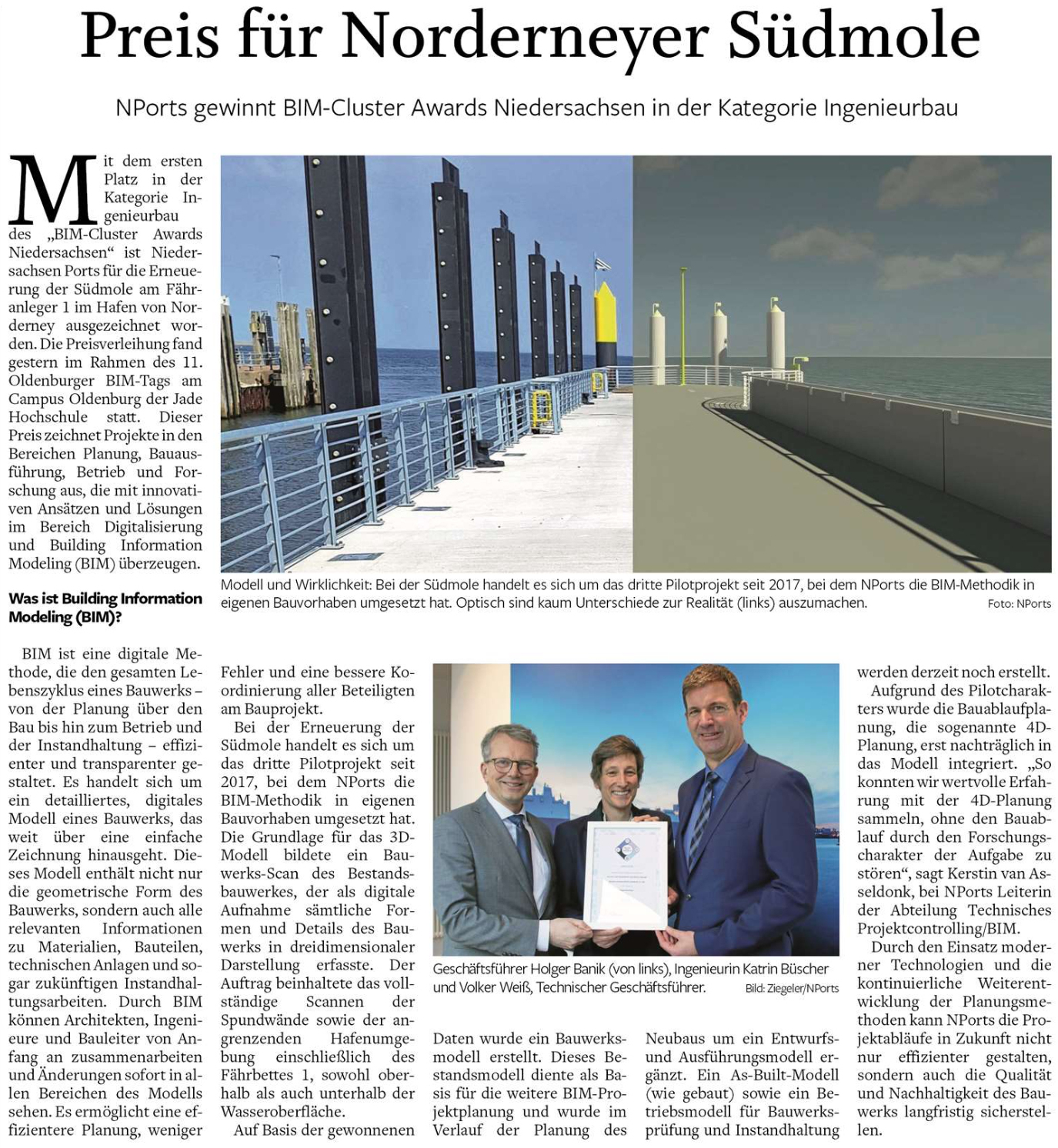 Weitere Infos NPorts gewinnt BIM-Cluster Awards Niedersachsen in der Kategorie Ingenierbau. (NBZ 05.02.2025)